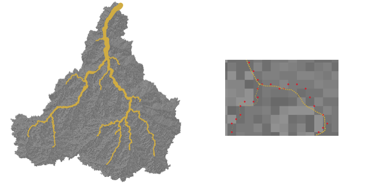 Figure 1: The Maroni basin. Left: In gray, extent of the hydrological model (distributed of a 1×1 km² grid). In yellow, extent of the hydraulic model, derived from the SWOT River Database. Right : zoom on hydraulic grid (yellow) vs hydrological grid cells outputs to couple (red).
