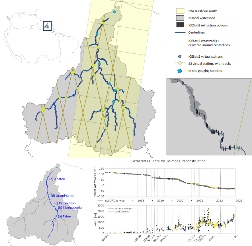 Figure 2: In situ and satellite observability of the Maroni basin. Observations carry information on river geometry, useful to build the model, and on basin response, seen heterogeneously throughout the hydraulic domain, useful for calibrating the model.